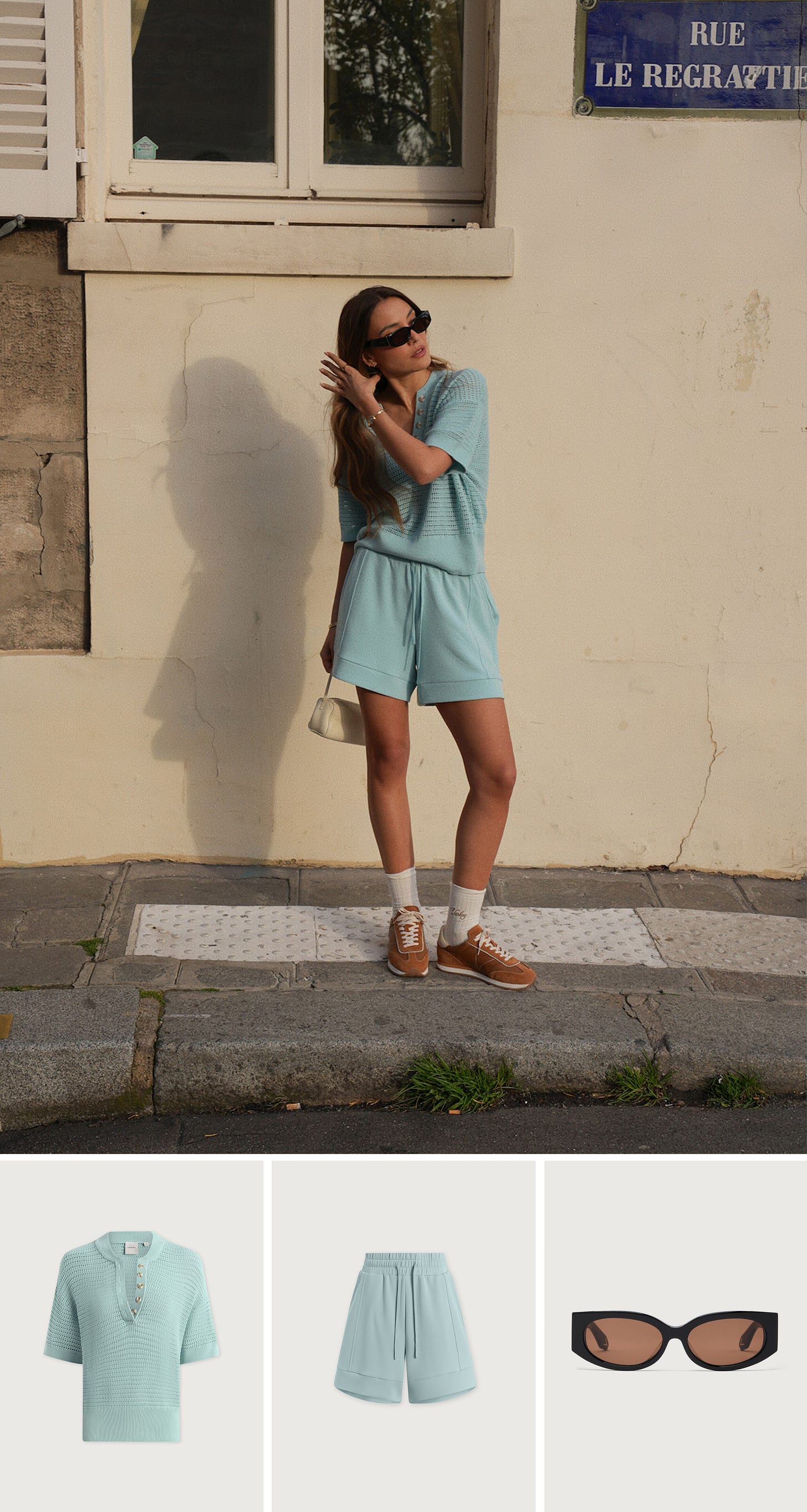 From the left: Callie Knit Top - Porcelain Blue / Atrium High Rise Short 4.5” - Porcelain Blue / Lambeth Oval Sunglasses - Black