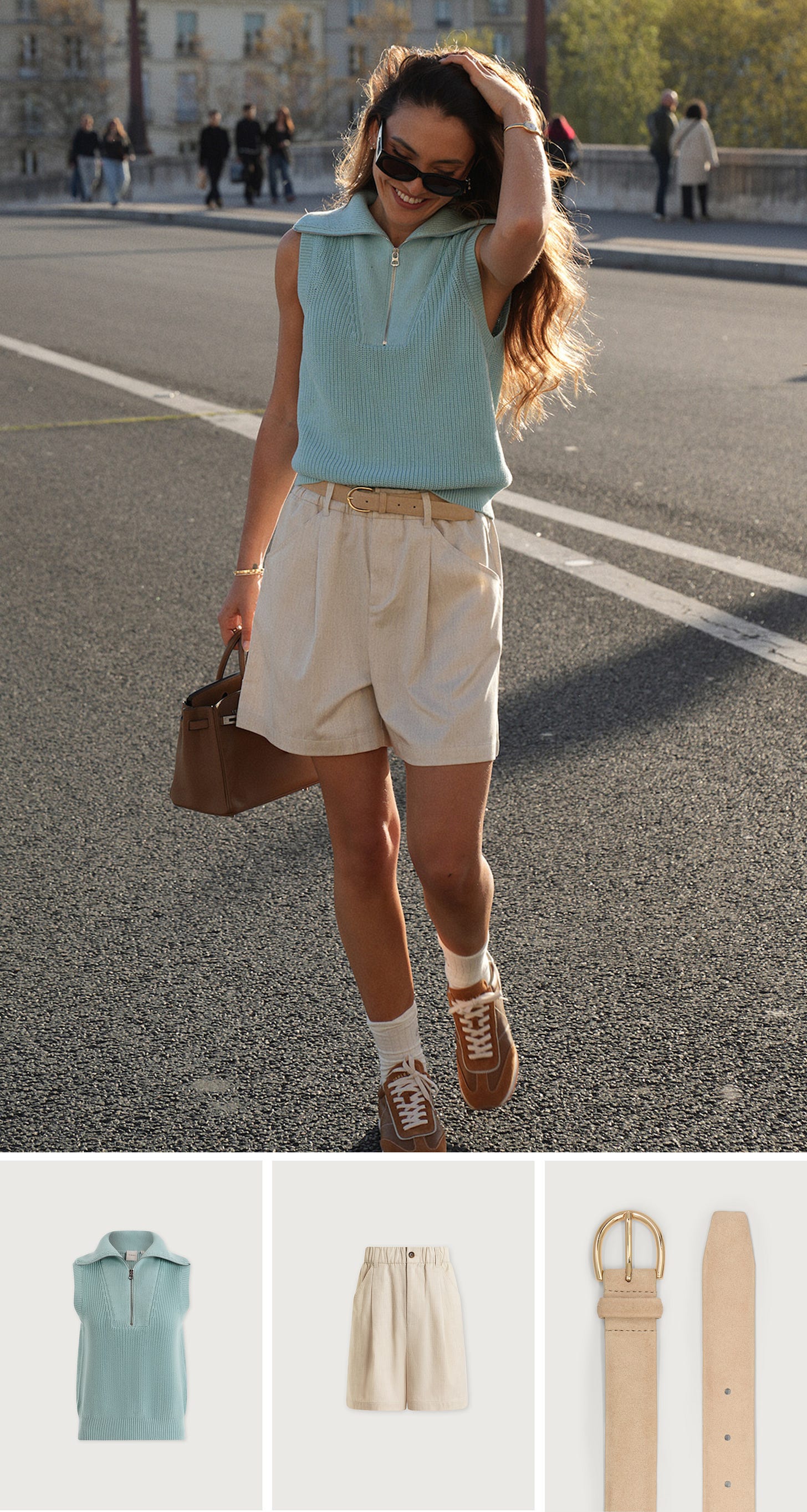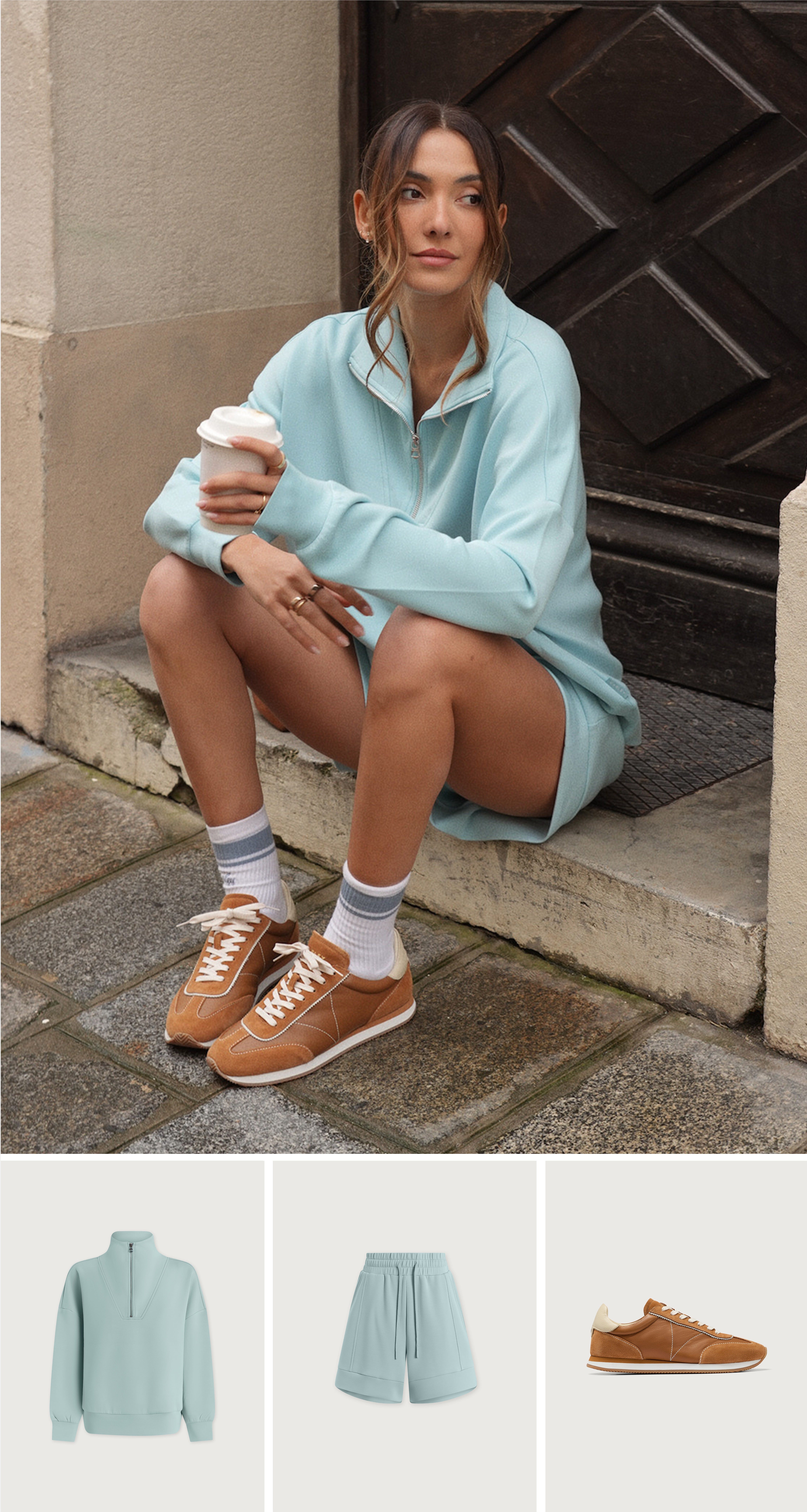 From the left: Hawley Half Zip Sweat - Porcelain Blue / Atrium High Rise Short 4.5” - Porcelain Blue / Aleone Runner - Caramel