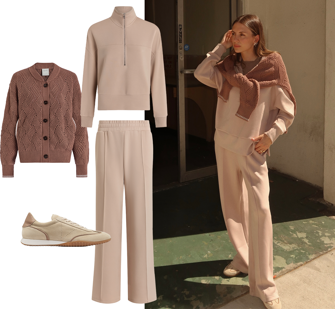 From the left: Venner Knit Jacket - Brownie / Kayleigh Half Zip Sweat - Mushroom / The Wide Leg Pant - Mushroom / Asmei Suide Sneaker - White Pepper.