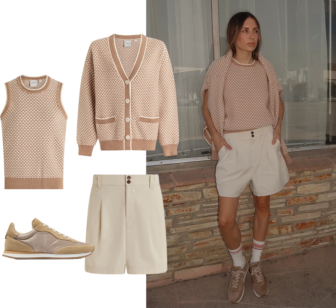 From the left: Jenson Stitch Knit Tank - Light Taupe / Tarran Stitch Knit Cardigan - Light Taupe / Amera Suede Runner - Taupe / Tansy Woven Short - Ivory
