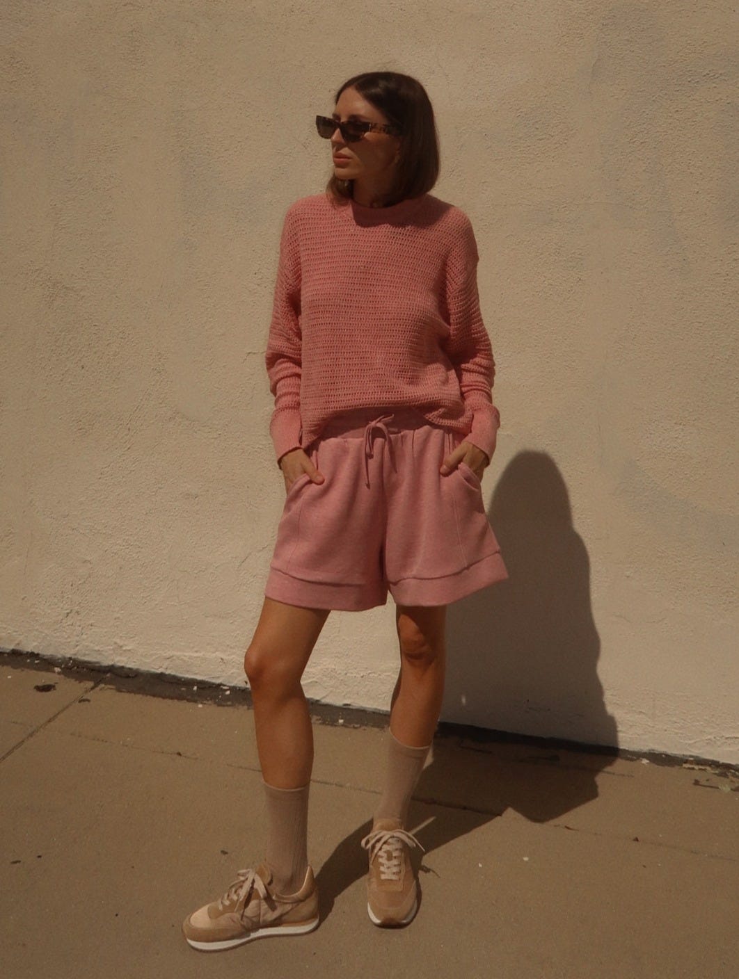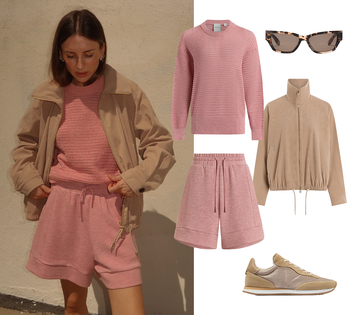 From the left: Kershaw Knit Sweater - Brandy Rose / Lambeth Oval Sunglasses - Rose Tortoise / Atrium High Rise Short - Rose Marl / Nadina Blouson Jacket - Light Taupe / Amera Suede Runner - Taupe